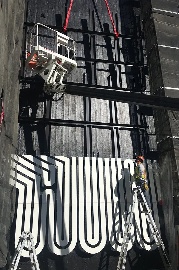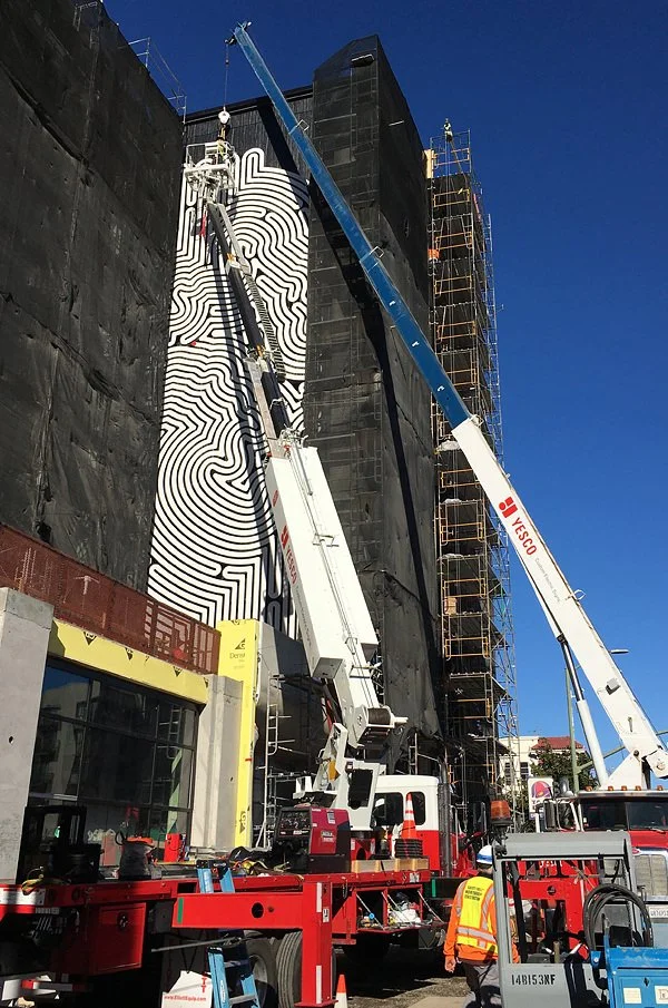 The wall art was installed using 20’-8” wide pre-made sections, from bottom to top, with special care taken to ensure each section was perfectly aligned throughout the installation. These were fabricated in 15 sections for shipping, weighing 800 pounds each, with 37 sheets of 4’-by-8’of painted aluminum. The total weight of aluminum is 12,000 pounds. Fabricated out of ¼-inch thick aluminum, Shapeshift Oakland is attached to horizontal stringers and vertical C-channels to stand off 9” from the face of the building.
